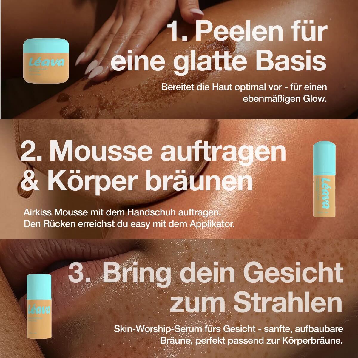 LEAVA ist eine moderne Self-Tan-Routine für Körper und Gesicht. Die Produkte wurden entwickelt, um einen gleichmäßigen, natürlichen Glow zu erzeugen - ohne Orangestich und ohne komplizierte Anwendung.